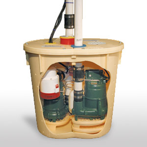 The TripleSafe™ Sump Pump System provides three levels of protection for your basement and your peace of mind. For normal functioning, the TripleSafe™ has a powerful, cast-iron Zoeller® ⅓ horsepower sump pump set at the lowest level. For heavy volumes of water or in case of primary pump failure, a second, more powerful Zoeller® ½ hp pump set a bit higher in the liner will take over. In case of a power outage, our UltraSump® battery backup sump pump, set at the highest level, will pump 11,500 gallons or more on a fully charged battery!