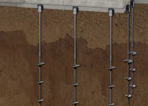 Like push piers, helical piers are attached to the foundation by mounting a bracket. Helical piers include rotating blades that are advanced (or "screwed") into the soil.