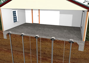 Foundation slab piers are straight steel piers that extend from stable soils deep below the structure to support brackets directly in contact with the underside of the slab. These piers are meant to support a settling concrete floor, and are not appropriate for foundation wall stabilization.