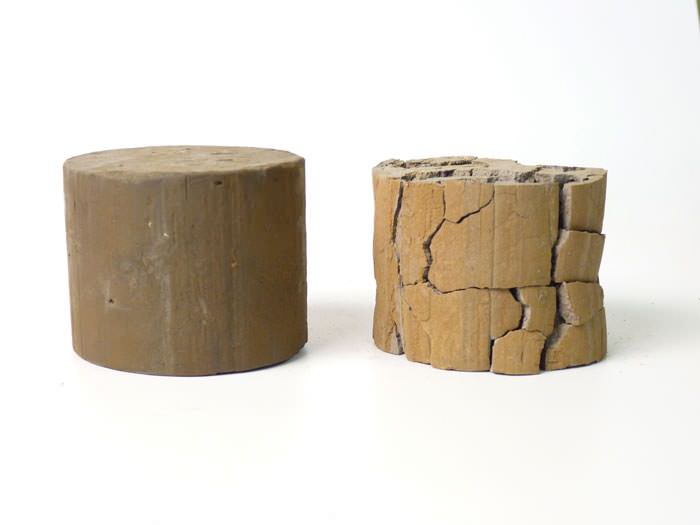 These two clay samples started out exactly the same in size, weight, and composition. The sample on the right was allowed to dry out, while the one on the left we kept moist.