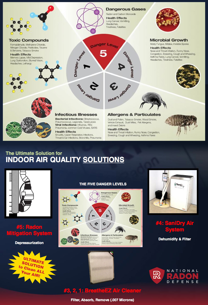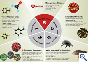 In addition to measuring and mitigating radon levels, we have solutions to reduce risks for all 5 danger levels, which includes particles, allergens, chemical pollutants, mold spores and high humidity.